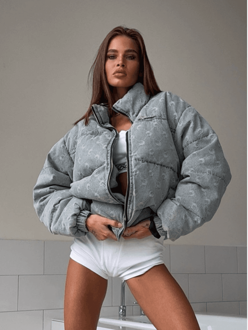 Áo khoác denim cotton họa tiết lưỡi liềm cổ điển Châu Âu và Mỹ cổ đứng phong cách đường phố ấm áp ngoài trời áo khoác nữ rộng rãi mùa thu đông mới