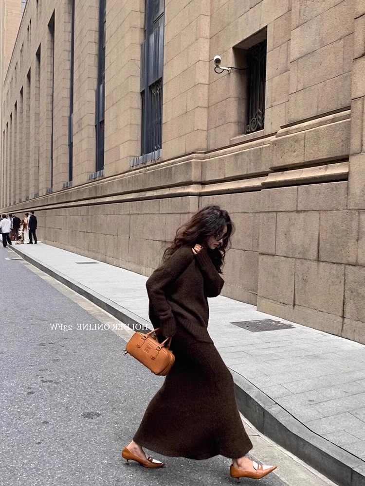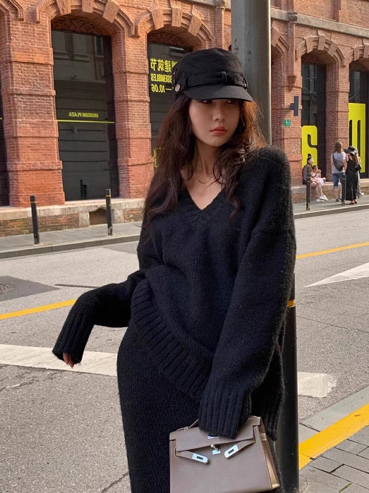 HOTBộ đồ len dáng rộng phong cách lười biếng dành cho nữ thu đông áo len dệt kim cổ chữ V thời trang hai mảnh