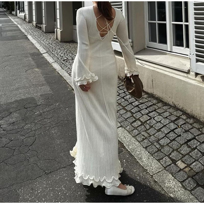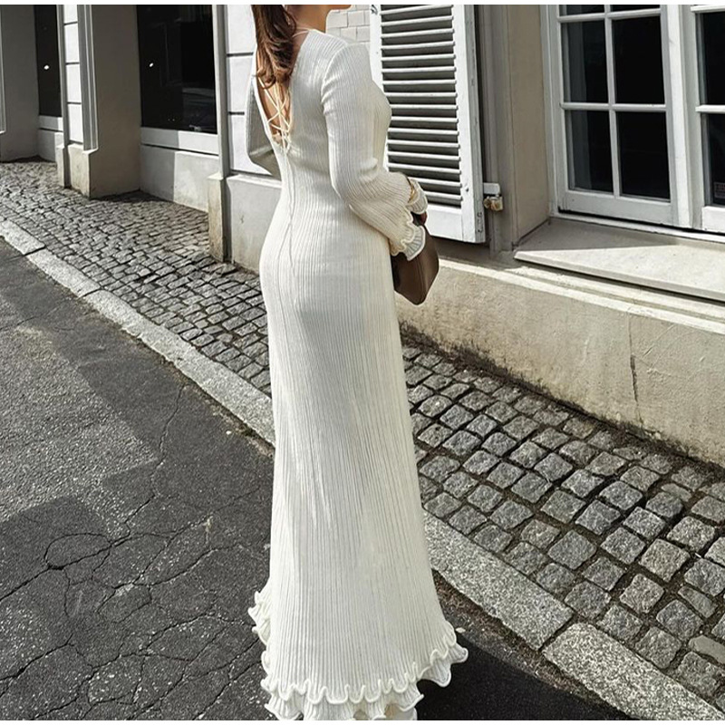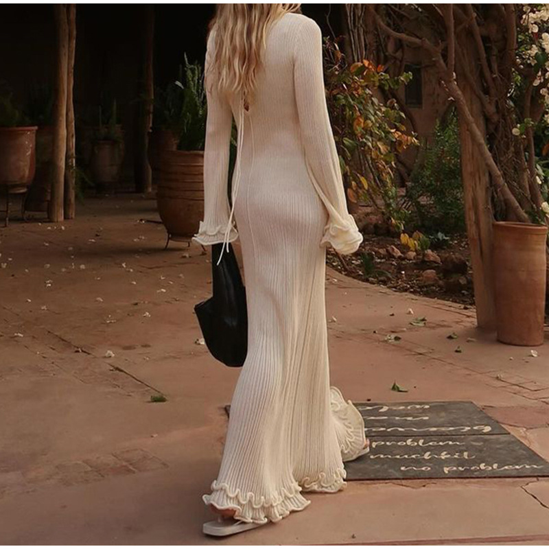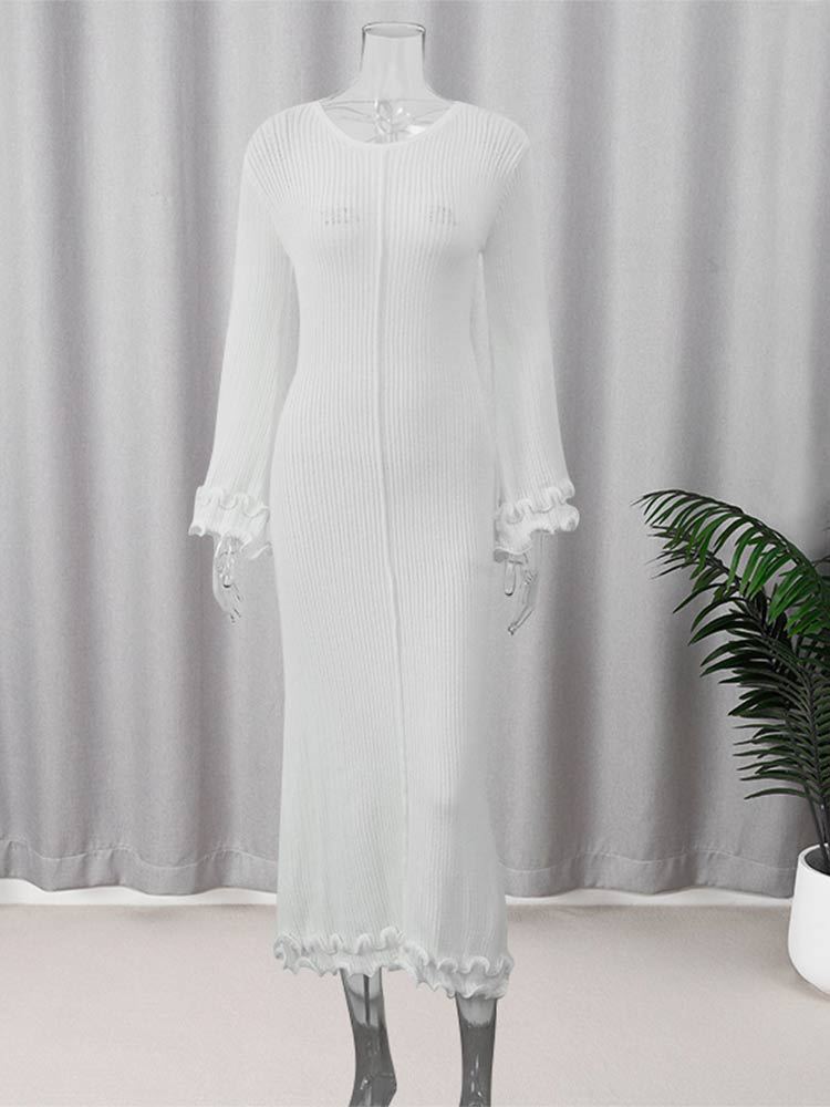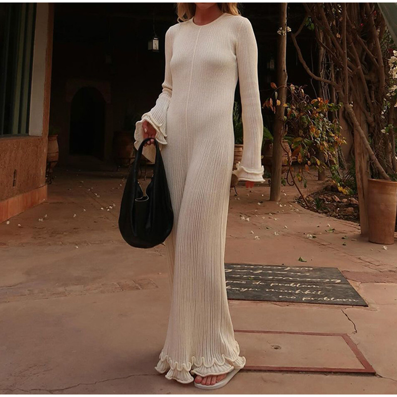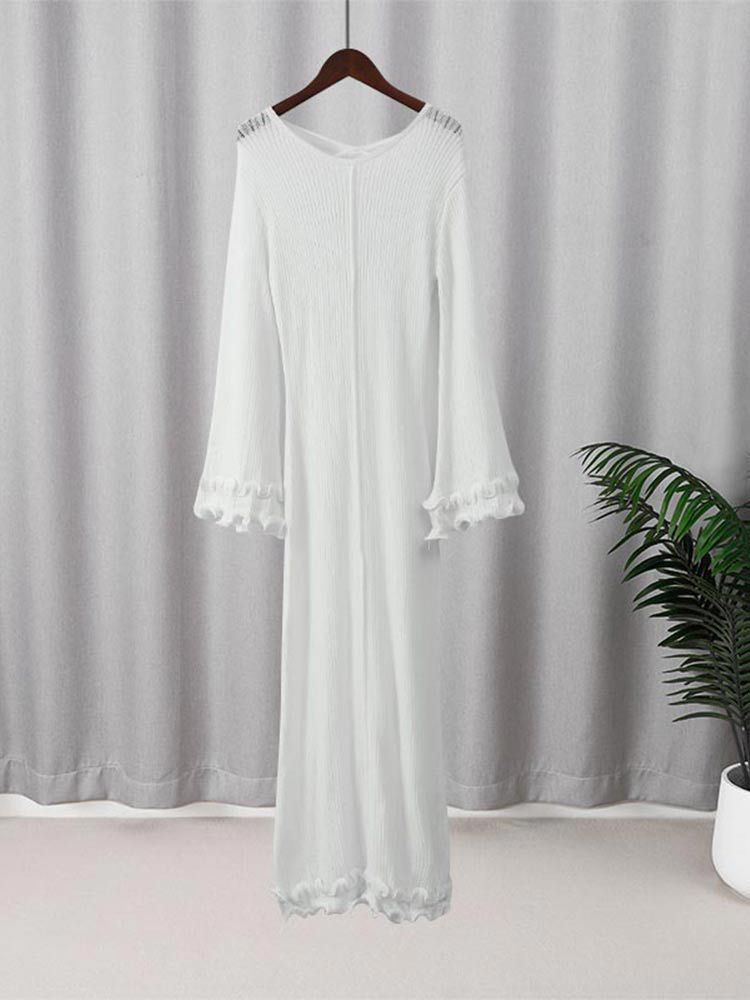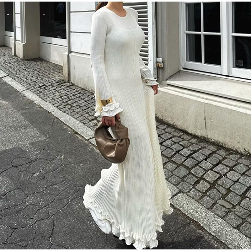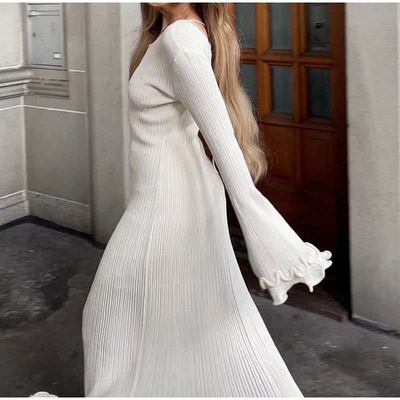 HOTReal Shot - Đầm dài dệt kim cổ tròn tay dài thanh lịch