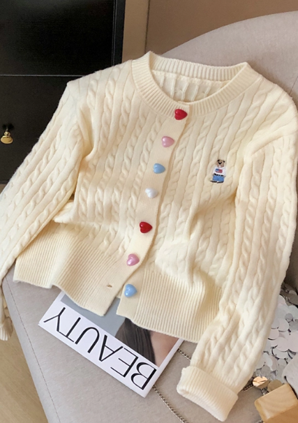 HOTÁo khoác cardigan dệt kim màu vàng kiểu Hàn Quốc dành cho nữ, kiểu ngắn, thêu hình trái tim, thu năm cuối