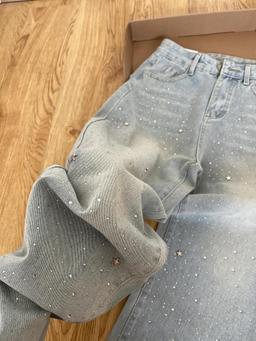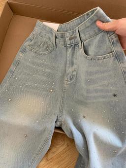 HOTQuần jeans ống đứng màu xanh nhạt đính đá lấp lánh bán chạy nhất dành cho nữ, kiểu dáng mới mùa thu 2025, cạp cao, ống rộng giúp thon gọn vóc dáng.