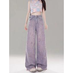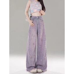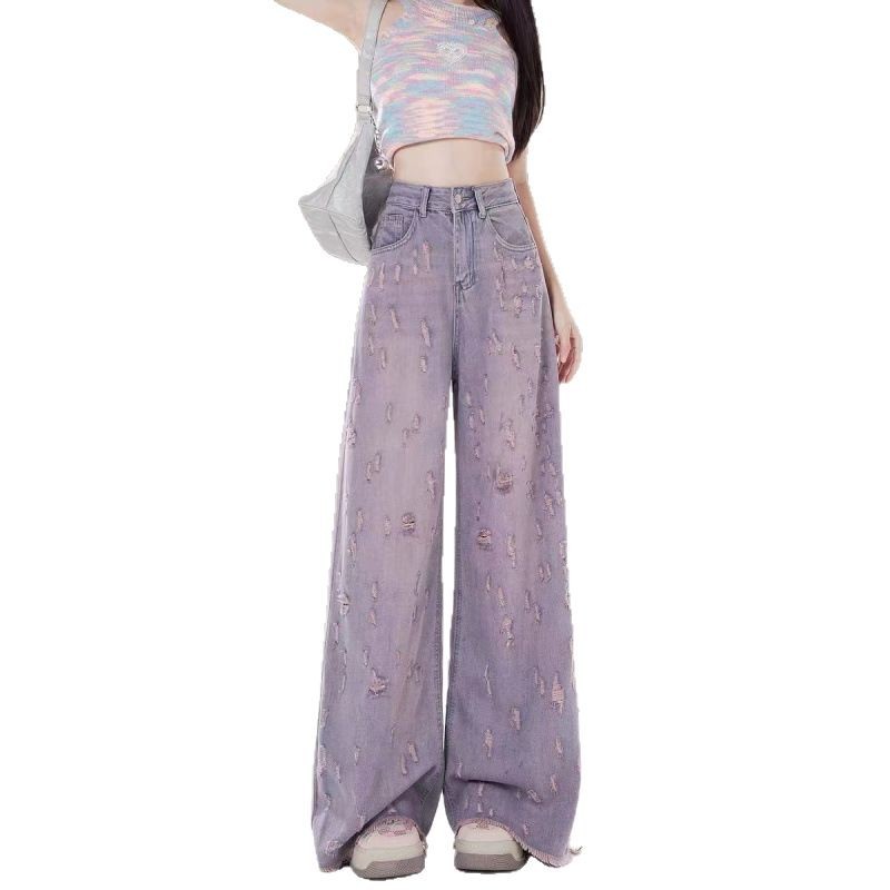 HOTQuần jeans ống rộng cạp cao màu hồng tím dành cho phụ nữ nhỏ nhắn, kiểu dáng mới cho mùa xuân và thu, với các chi tiết rách, viền tua rua và độ rũ mềm mại.